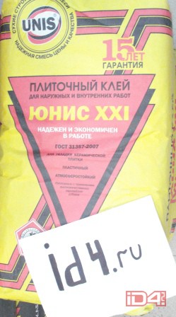 Стандартная керамическая плитка имеет вес, что не превышает 300 г на 100 см². Для такого материала можно применять строительный клей «Юнис ХХI», что используется как для наружных, так и для внутренних работ. Состав «Юнис 21» смешивается с водой в определённой пропорции, после чего облицовочные работы должны не превышать 2 часов, а при нанесении на пол или стену у мастера есть 10 минут, чтобы уложить и выровнять плитку.
